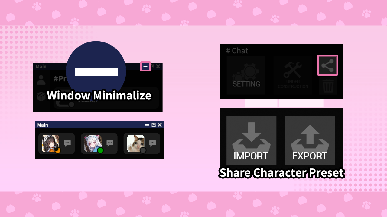 📂 프리셋 공유 (캐릭터 창) — 내가 만든 캐릭터를 파일로 주고받을 수 있어요. (VRM 모델 제외)